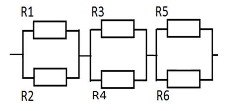 Sã se calculeze rezistenţa echivalentã pentru circuitul din figurã stiind cã fiecare rezistenţã are valoarea de 2 Ω.